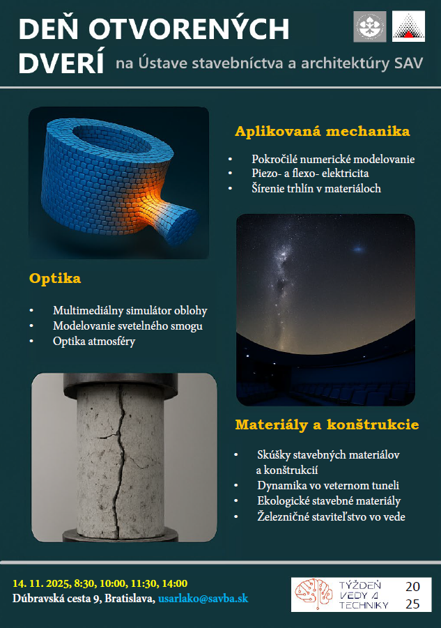 Visitors will see how new types of building materials are tested, learn about research area of applied mechanics, as well as modern methods of numerical simulations in statics and dynamics. They will also see a new multimedia sky simulator (the 1st planetarium in Bratislava) and its use in light pollution research.